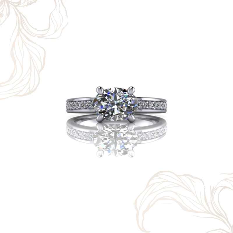 Tasarımın omurgasını oluşturan kanal set band, tüm kesim seçeneklerinde ortak bir zarafet dili kurar. Pırlantaların iki metal ray arasına, band yüzeyiyle aynı düzlemde yerleştirildiği bu teknik; hem görsel hem yapısal açıdan güçlü bir tercih olup her açıdan kesintisiz bir ışıltı sunar. Montürün tabanındaki özgün bölünmüş yapı ise yüzüğe imza niteliğinde bir karakter kazandırır.