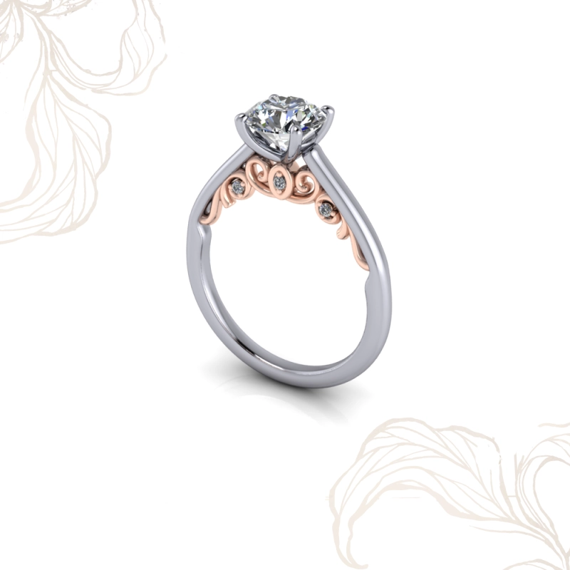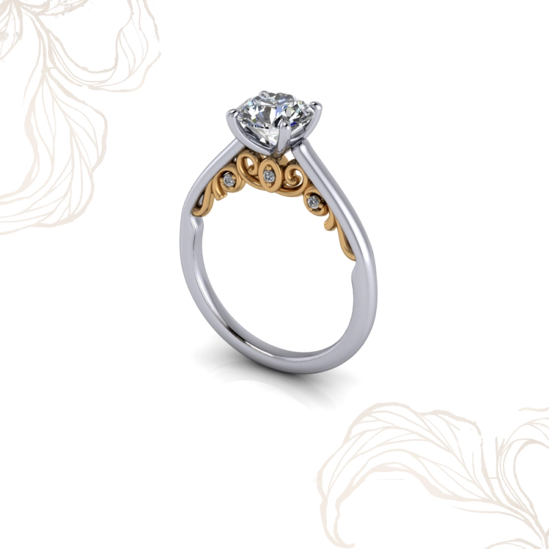 Fulya’nın filigree versiyonunda omuzlardaki kıvrım işlemeleri sarı altın veya rose altın seçeneğiyle sunulur. Her iki tercih de beyaz altın band ve montürle birleştiğinde güçlü bir iki tonlu kontrast oluşturur.